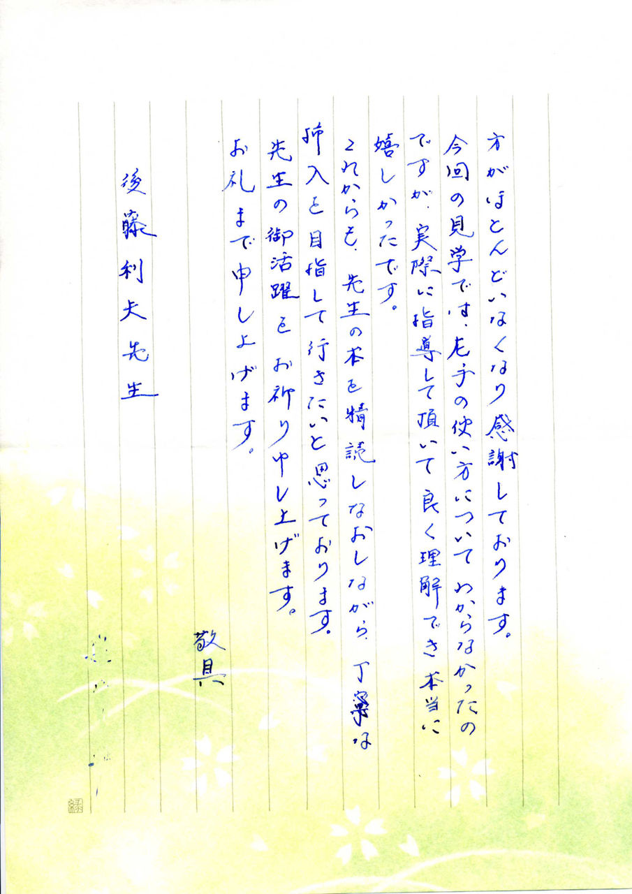 2017年10月10日 見学のお礼とお詫び 遠くから姫路第一病院に見学に来られました。 私が帰りの時間を聞かなかったために、別な先生が検査をして私の検査は1例しか見学していただきませんでした。 私の失態で深く後悔しております。早く帰られることを知っていたら検査の順番を変えて見ていただくことも可能でした。 わざわざ何時間もかけて見学に来られて申し訳ないことをしました。 それにも関わらずご丁寧なお手紙までクリニックに頂きました。 ほんとうに申し訳ありませんでした。心やさしいお手紙ありがとうございます。