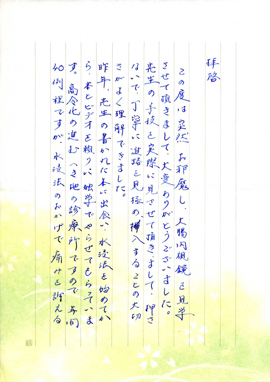2017年10月10日 DVDのお礼 クリニックにDVDのお礼のお葉書が来ていました。 このようなお葉書を頂くと本当にお送りして良かったと嬉しく思います。 ありがとうございます。 追伸。名人芸ではないです。水浸法+ワンパターンメソッドをやれば皆同じ技量になります。実際、私が今まで50人ほどの医師を直接指導しましたが、みんな私とほとんど同じ技量です。