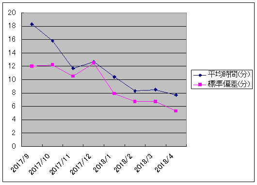 2017年8月に湘南厚木病院で人での研修を開始した。私が直接指導したのはこの1ヶ月間のみである。9月からは大隅鹿屋病院に赴任し、再び一人で平日ほぼ毎日の内視鏡検査を実践した。2017年9月から2018年4月までの堤先生の大腸内視鏡挿入時間の変化を表にしたものが表1であり、それをグラフ化したのものが図1である。